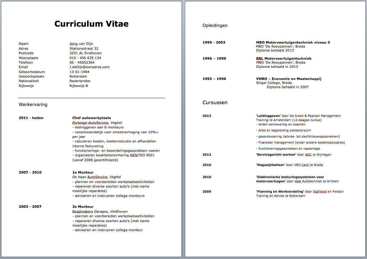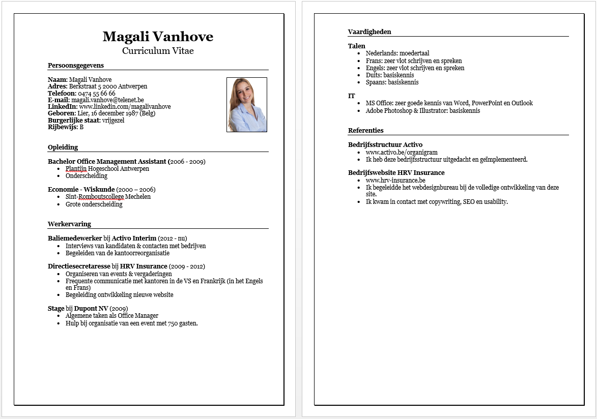 Voordat je begint met het schrijven van een cv is het handig eerst een paar voorbeelden te bekijken. Hoe zien cv’s van anderen eruit en op welke manier onderscheiden zij zich doormiddel van hun cv? Dit voorbeeld cv gemaakt in Word helpt en geeft je wellicht inpiratie bij het maken van je eigen curriculum vitae.